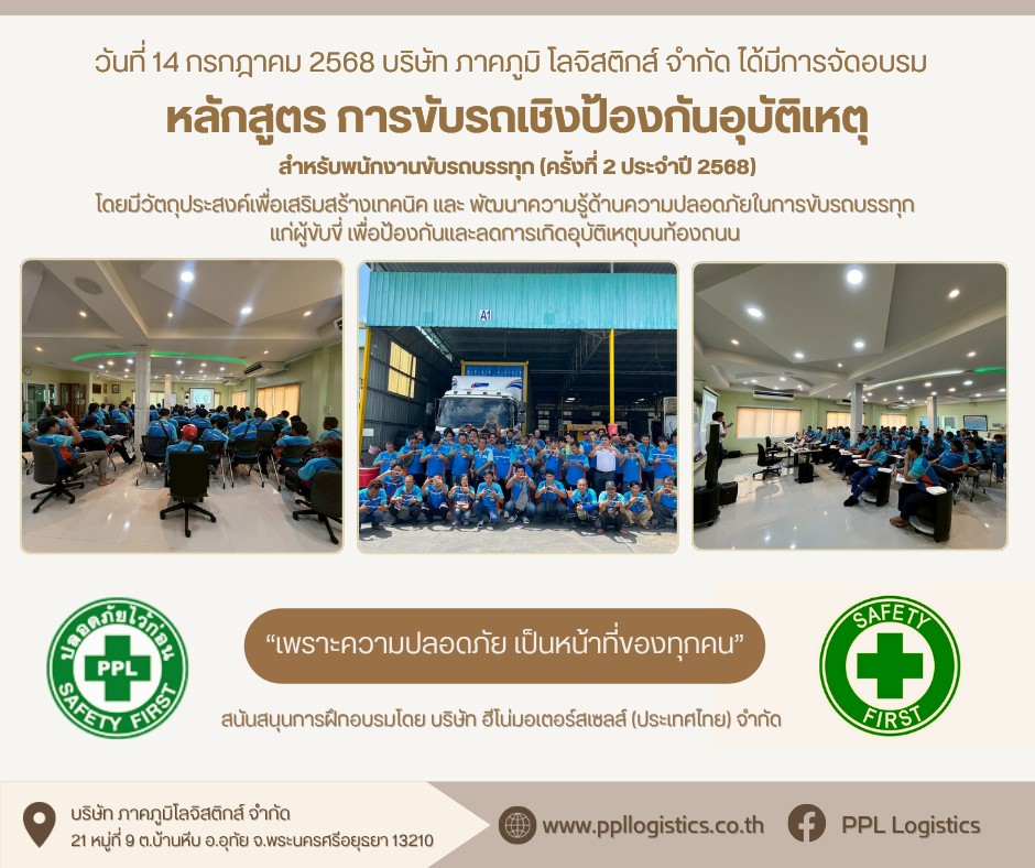 14 กรกฎาคม 2568 บริษัท ภาคภูมิโลจิสติกส์ จำกัด ได้จัดอบรมขับขี่ปลอดภัยให้แก่พนักงานขับรถ ในหลักสูตร การขับรถเชิงป้องกันอุบัติเหตุ สำหรับพนักงานขับรถ (Defensive Driving for Truck Drivers) ครั้งที่ 2/2568